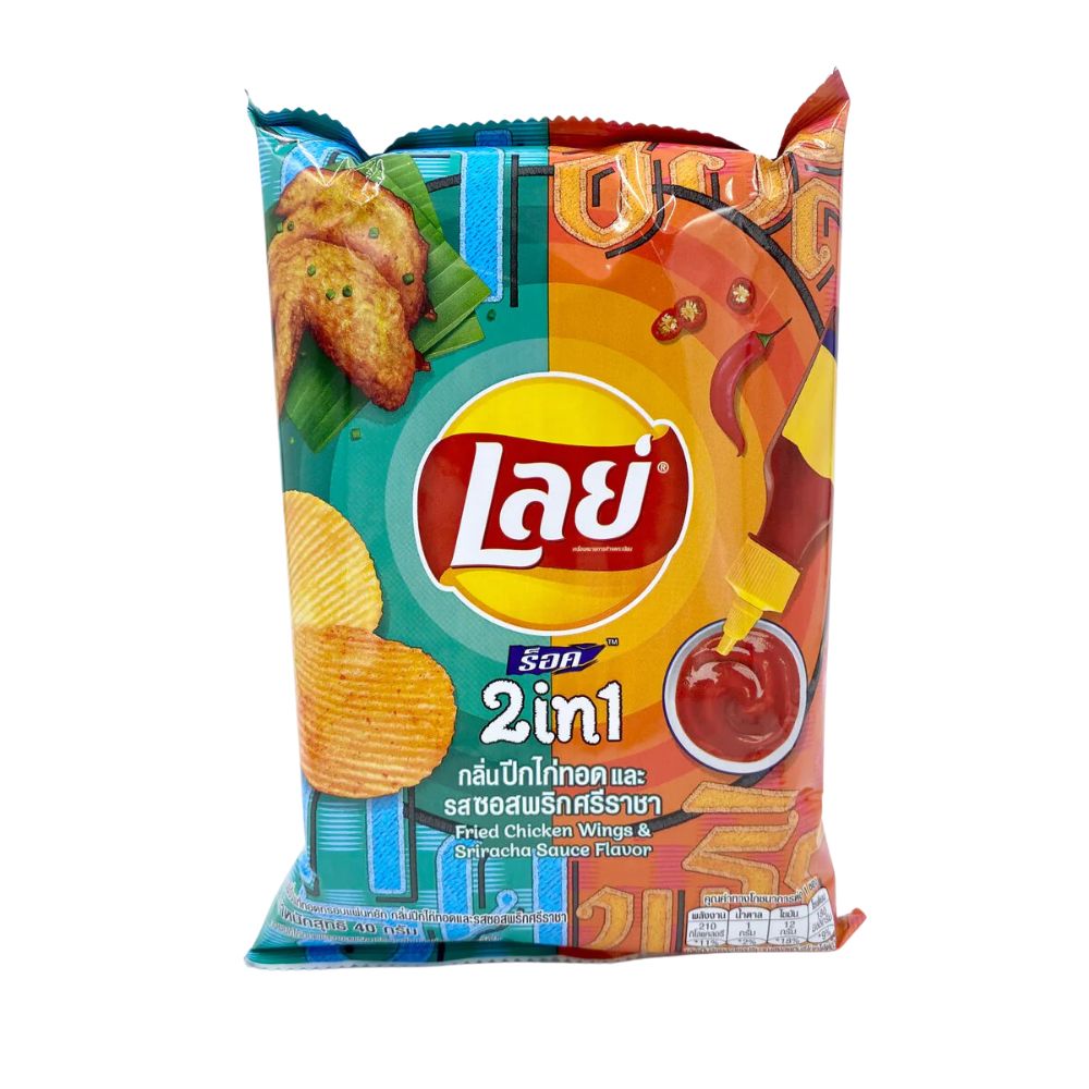 Lays 2IN1 Fried Chicken Wings & Sriracha Sauce Flavor is a popular snack in Thailand. The chips have a satisfying crunch and a seasoning that combines the flavors of fried chicken wings and spicy Sriracha sauce, creating a unique and bold taste.