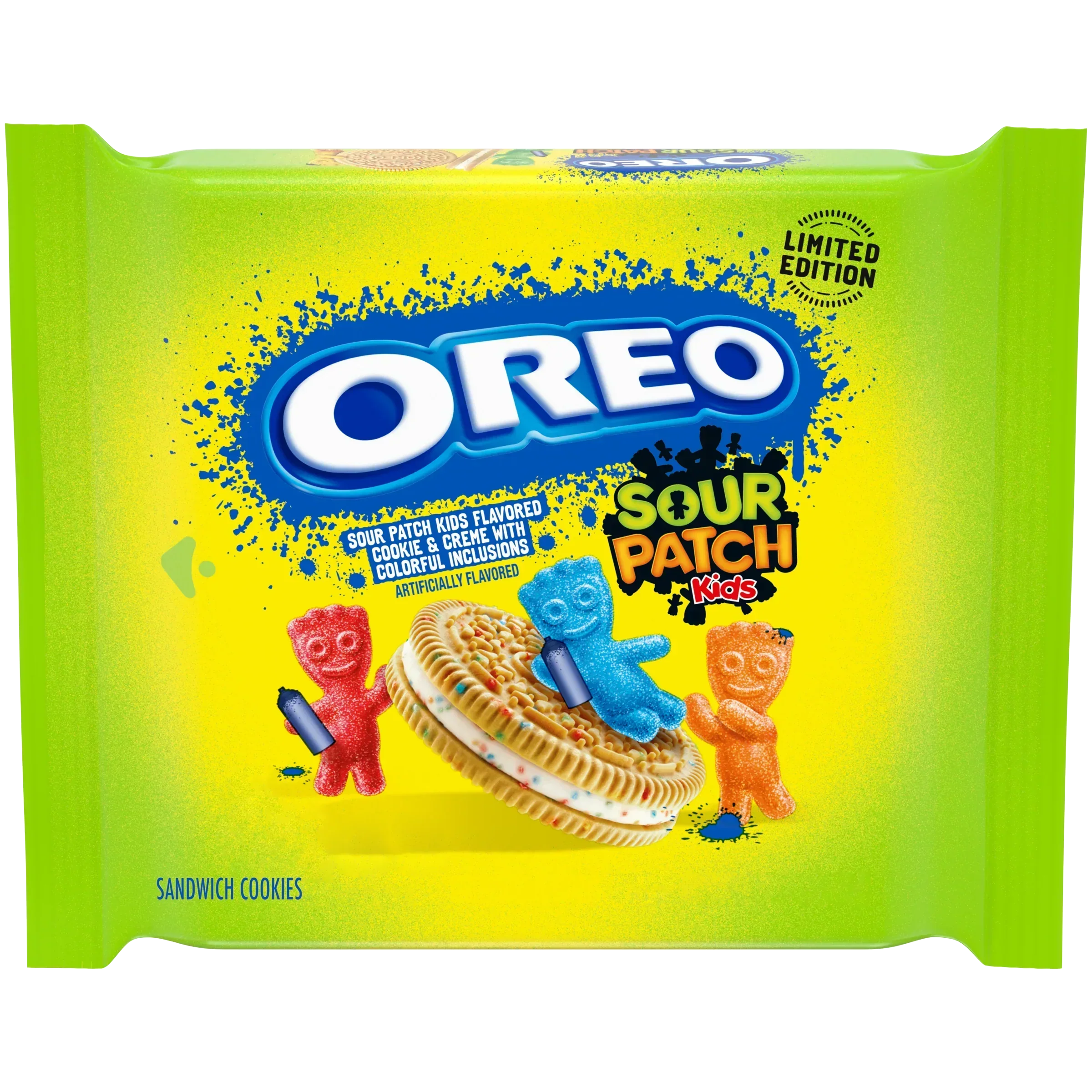 Unique SOUR PATCH KIDS-flavored cookie and creme with colorful inclusions and signature OREO cookie embossment. Snack food sandwich cookies with a deliciously sweet and sour mix of flavors: SOUR. SWEET. OREO.