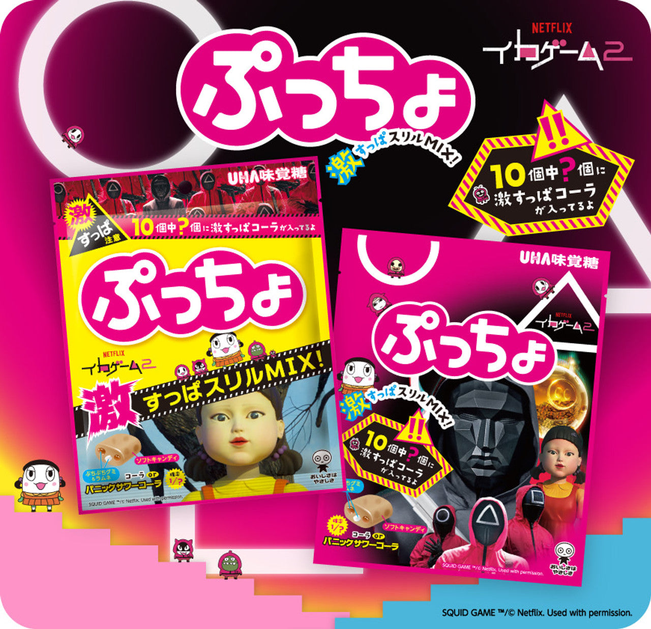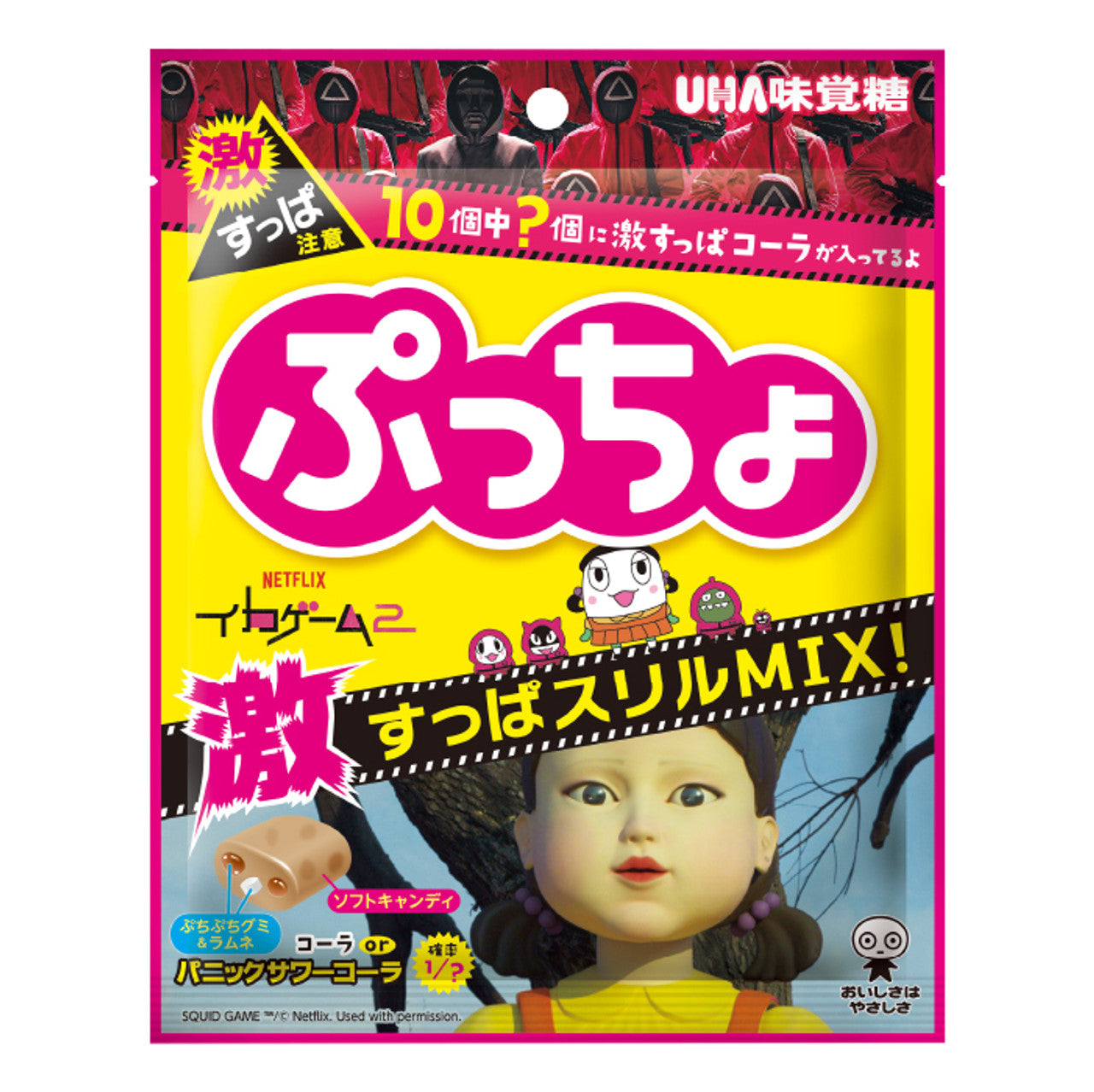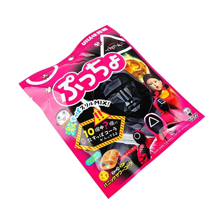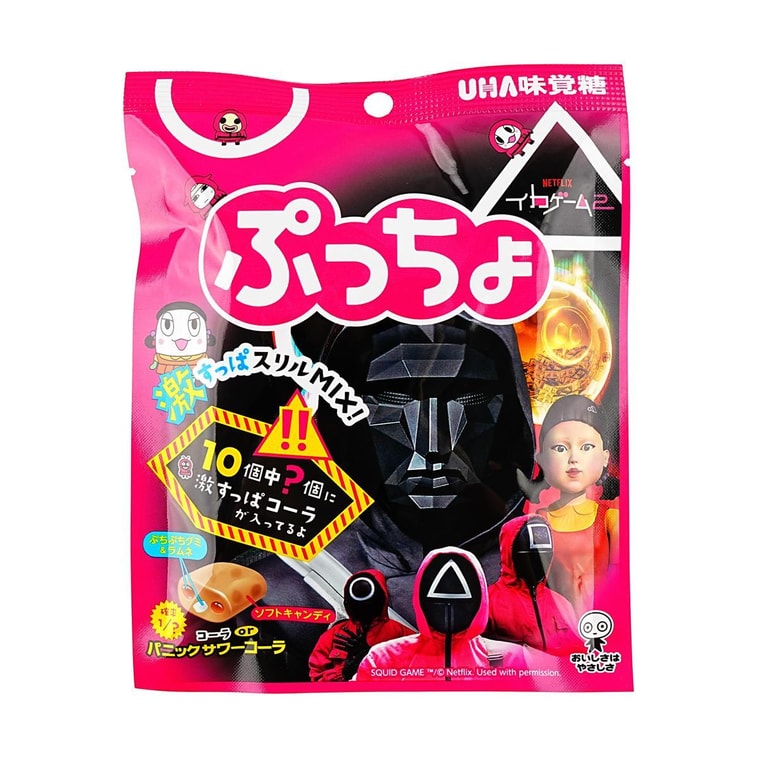UHA Puccho Squid Game Candy 6pck (Japan) is a fun and collectible candy inspired by the hit series! Each pack includes chewy, flavorful candies featuring characters and themes from Squid Game. A must-have for fans, this imported Japanese treat combines playful design with delicious taste—perfect for gifting or enjoying yourself!